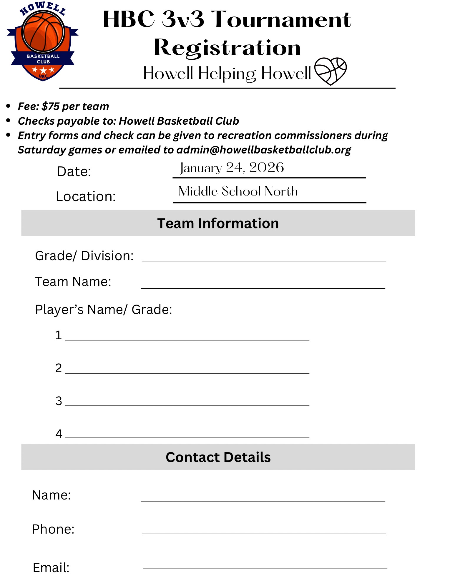 The 2026 HBC 3v3 Tournament - Howell Helping Howell Benefit - will be held on January 24, 2026 at Middle School North.  Come join us for fun games, three point contests, best team theme contests and so much more. All funds will be donated to a Howell family in need.